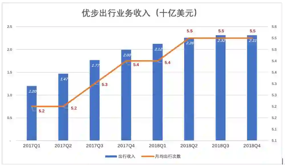 用户数增速不理想,用户的使用频率则完全停滞。单看出行业务,2018年后三季度用户月均使用优步的频率均为5.5次/月。
