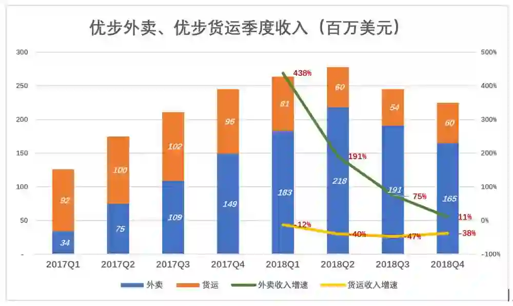 进入2018年,优步外卖业务增速“戏剧性”下降:Q1同比增长438%、Q2同比增长191%、Q3只有75%、Q4跌到11%,比急刹车还急。