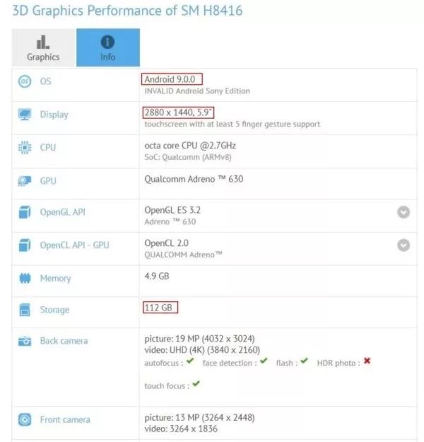 据媒体报道,日前,型号为H8416的神秘索尼新机曝光在GFXBench上,该机可能是代号(Akatsuki/晓)的Xperia新机。从图中可以看到,新机预装了安卓9.0系统,并且搭载了索尼手机史上首次的2K屏幕——即分辨率为2880×1440的屏幕,尽管索尼用过4K屏,但用2K屏幕还是头一次。另外屏幕大小为5.9英寸,比索尼Xperia XZ2的5.8英寸稍大一些。值得一提的是,该机搭载了6+128GB的存储组合,在索尼手机上也是首次。不过该手机只有一颗1900万像素主摄像头。