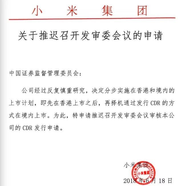 而后,小米官方微博今日早间称,公司经过反复慎重研究,决定分步实施在香港和境内的上市计划,即先在香港上市之后,再择机通过发行CDR的方式在境内上市。为此,公司向中国证券监督管理委员会发起申请,推迟召开发审委会议审核本公司的CDR发行申请。