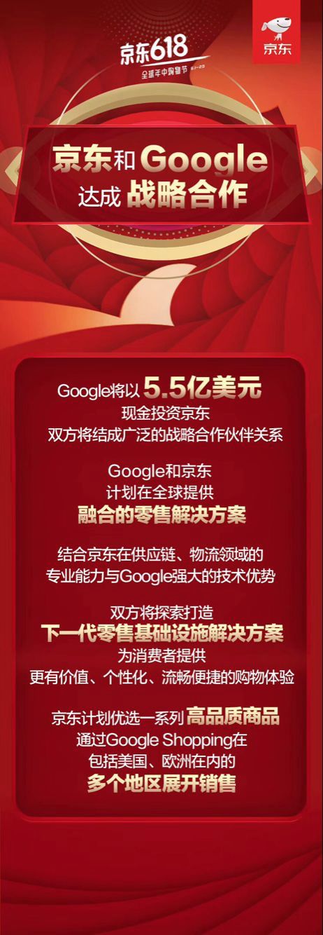 6月18日,京东官方宣布,谷歌5.5亿美元入股京东,双方将展开战略合作。根据协议,Google将收购27106948股新发行的京东普通股,发行价为每股20.29美元。公告称,Google和京东计划在全球提供融合的零售解决方案,结合京东在供应链和物流领域的专业能力,与Google的强大的技术优势,双方将探索下一代零售基础设施解决方案,为消费者提供更有价值、个性化、流畅便捷的购物体验。京东还计划优选一系列高品质商品,通过Google Shopping 在包括美国、欧洲在内的多个地区展开销售。