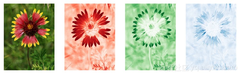 从左到右,依次为:原始图像,红色,绿色,蓝色。