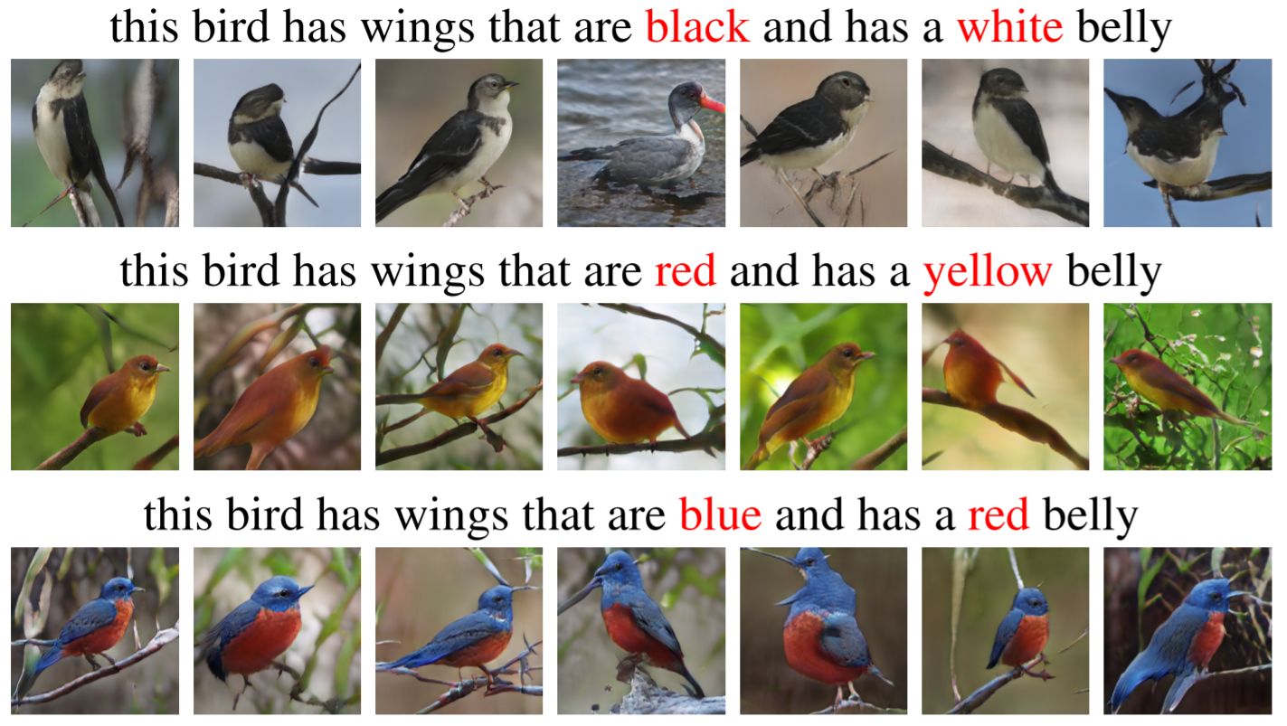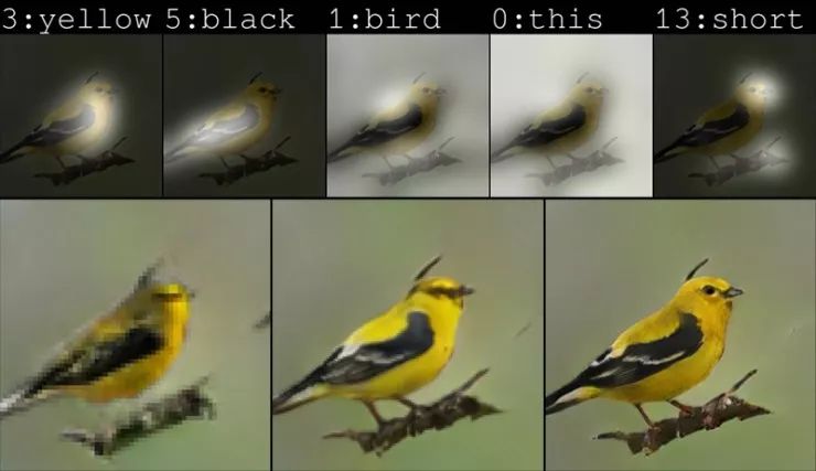 当从简单的文字描述(例如蓝鸟或常青树)产生图像时, GAN 可以很好地工作,但在更复杂的文本描述中效果不佳,例如具有绿色的冠、黄色的翅膀和红色腹部的鸟。这是因为整个句子作为了生成器的唯一一个输入,其中的详细信息发生了丢失。因此,生成的图像是一种模糊的带绿色和微黄色的鸟,而不是与描述中的词汇紧密匹配。