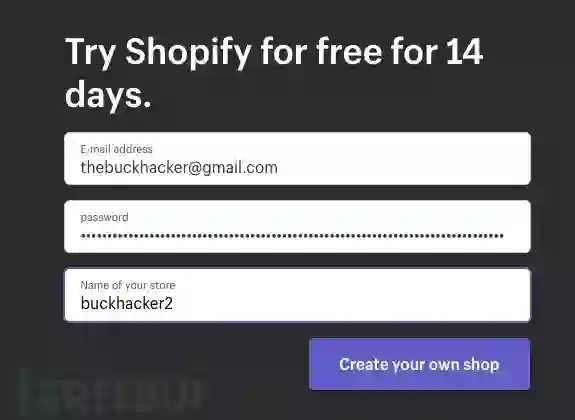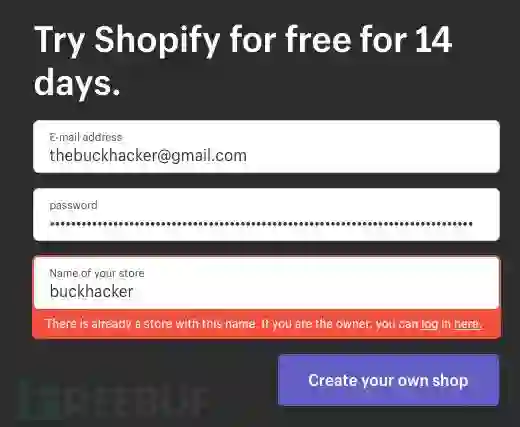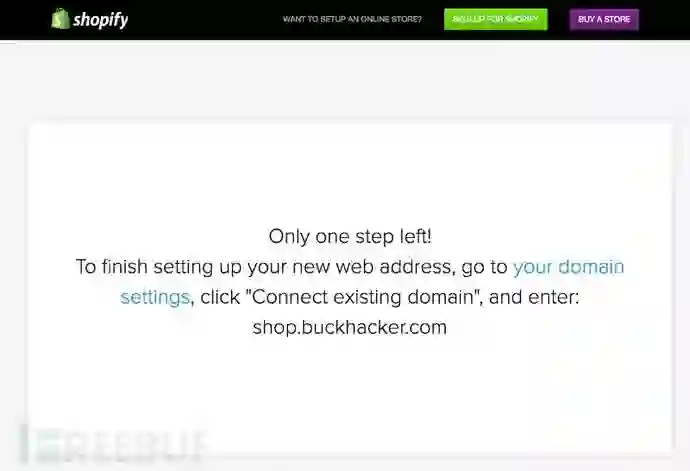 如果在Shopify记录中,商店名称(像这里的buckhacker)未被注册认领(claim),那么,我们可以注册认领它,然后进行子域名劫持测试。那如何知道某个商店名称是否被注册认领(claim)了呢?