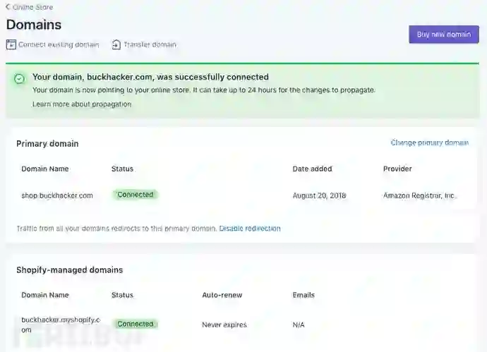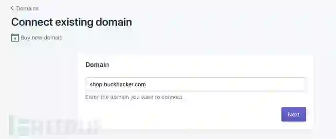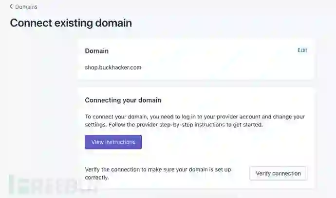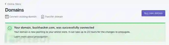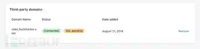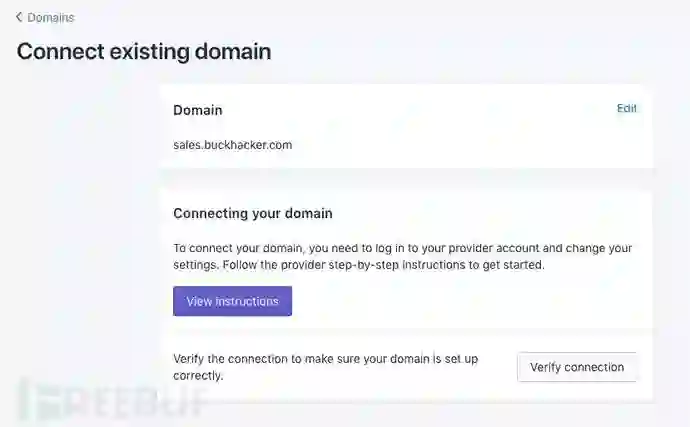 这算是Shopify上常见的子域名劫持情况了,这种配置下,我们可以创建一个可注册的商店名,再按照像前述的测试方式,在Shopify管理后台中去连接管理其对应的域名。以下是其操作方式,如在我的后台中去连接sales.buckhacker.com: