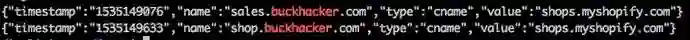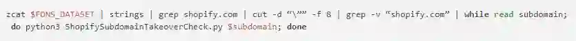 Rapid7的FDNS数据集中包含了大量的CNAMES记录,所以,其实我们要做的就是在这个数据集中寻找CNAME指向shop.myshopify.com或者myshopname.shopify.com的子域名,围绕这两个域名的相关记录,再深入检查是否存在子域名劫持漏洞。
