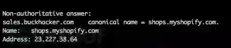 该例子中,我们可以为指向buckhacker.shopify.com的shop.buckhacker.com映射设置一条别名记录(CNAME)。以下是对shop.buckhacker.com的nslookup信息: