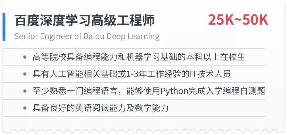 本课程培养目标对标百度深度学习高级工程师,可以帮助你在6-8个月内达到能够合理组合、改造并创新模型来解决企业级应用问题的水平。