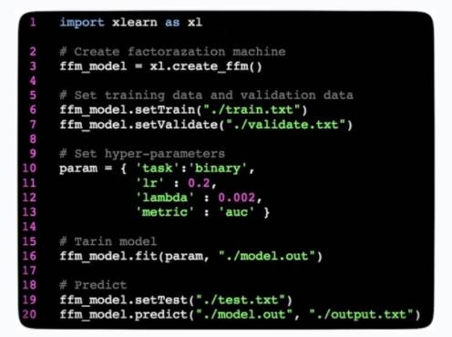 (3)易用性和灵活性,xLearn 提供简单的 python 接口,并且集合了机器学习比赛中许多有用的功能,例如:cross-validation,early-stopping 等。除此之外,用户可以灵活选择优化算法(例如,SGD,AdaGrad, FTRL 等)