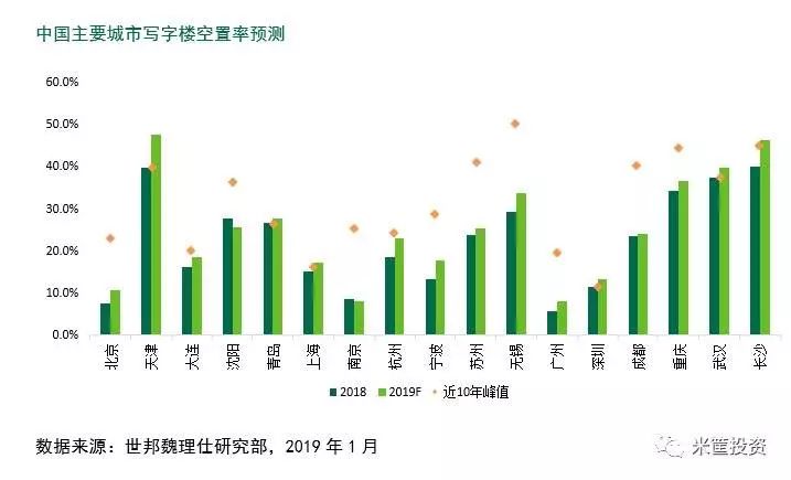 社科院在5月发布的《中国房地产发展报告(2019)》中,引用世邦魏理仕的数据预测,2019年底中国17个大中城市写字楼平均空置率将突破20%。