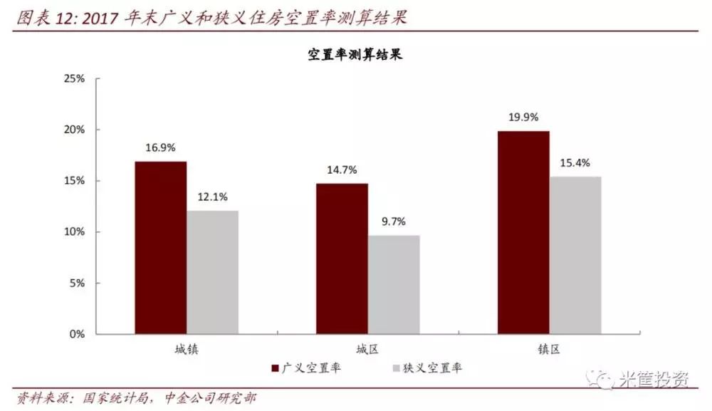 3)中金公司《数说中国存量住房》报告数据:2017年末中国城镇广义和狭义住房空置率分别为16.9%和12.1%。
