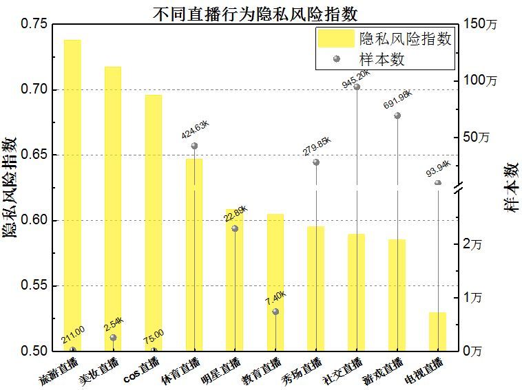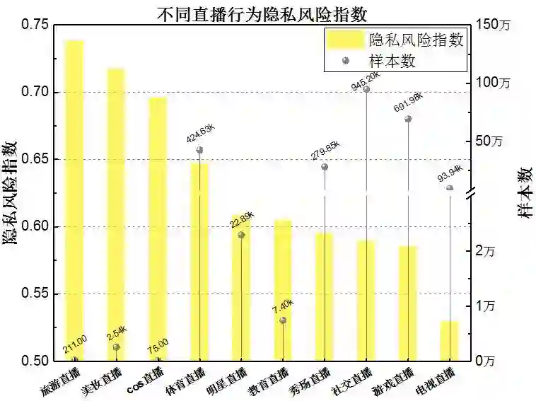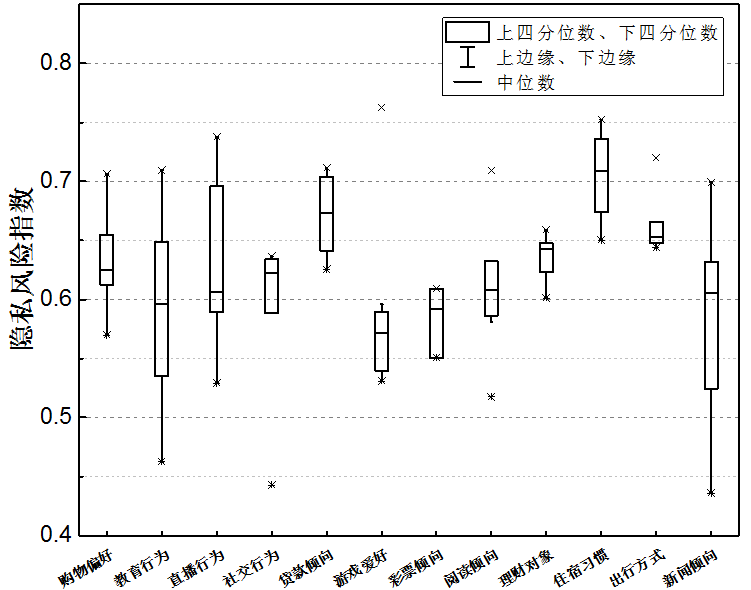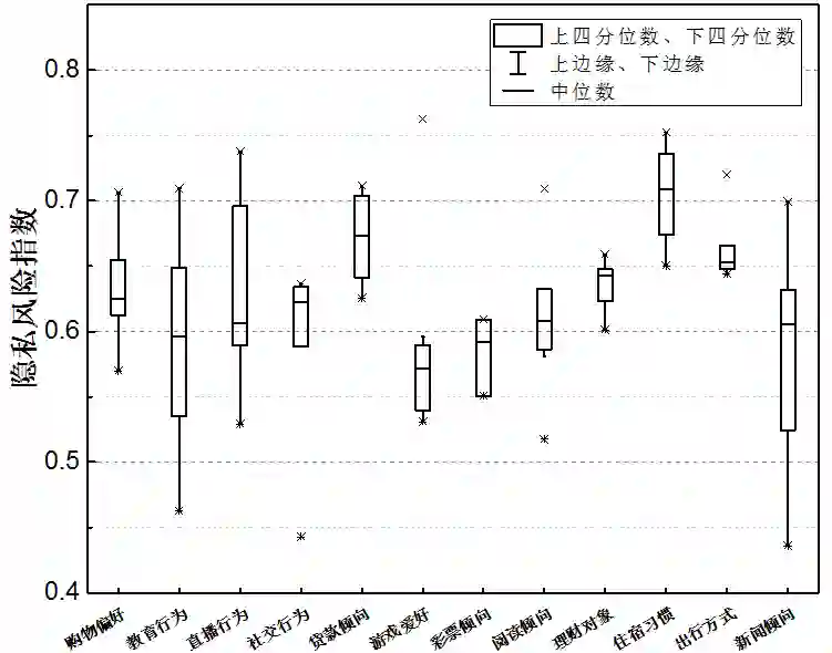 行为隐私风险指数:具有外宿、贷款倾向行为的人群隐私风险普遍较高,而爱好游戏、阅读的人群隐私风险偏低;此外,不同教育行为、直播行为和新闻倾向人群隐私风险指数差异较大。
