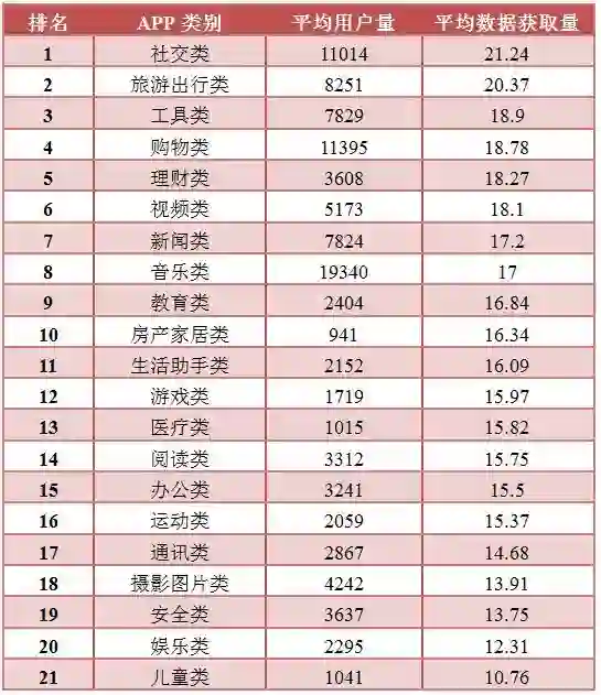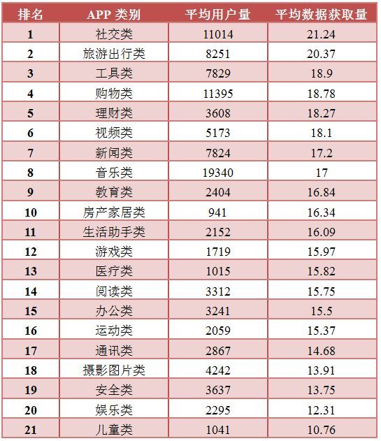 App类别数据收集特征:社交类、旅游出行类、工具类、购物类和理财类App平均获取用户数据最多,更容易泄露用户隐私。相反地,儿童类、娱乐类、安全类App则较为安全。