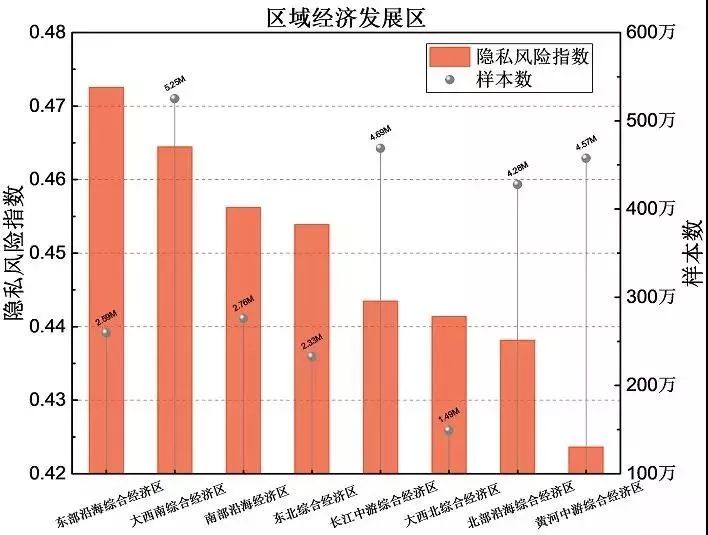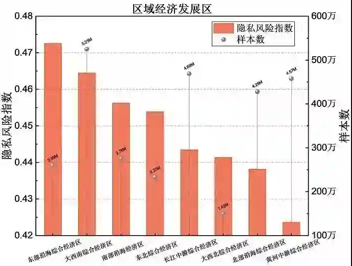 据2016年国务院发展研究中心《地区协调发展的战略和政策》提出的八大综合经济区(东北综合经济区、北部沿海综合经济区、东部沿海综合经济区、黄河中游综合经济区、大西北综合经济区、大西南综合经济区、长江中游综合经济区和南部沿海经济区)构想,本报告对各经济区隐私风险指数进行分析,结果表明,东部、南部沿海以及大西南地区隐私风险指数偏高,黄河中游、北部及西北地区隐私风险则偏低。