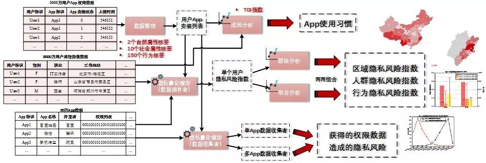 通过调研,权限分析是最简单有效的App隐私风险分析方法,其基本思想是移动用户数据是通过App权限请求而泄露的,相应地,数据收集者也是基于App权限权限来获取用户数据的。进而,该报告从移动场景下两大数据主体——数据拥有者(移动用户)、数据收集者(本报告仅讨论App开发者)角度入手,构建基于权限的隐私风险量化模型。