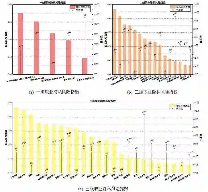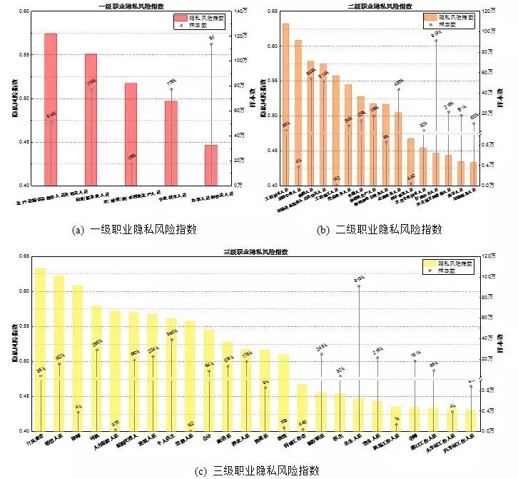 对于五类一级职业,隐私风险指数由高到低依次为生产/运输设备操作人员及有关人员、商业服务人员、农/林/牧/渔/水利业生产人员、专业技术人员、办事人员和有关人员;二级职业中,工程技术人员隐私风险指数最高,运输服务人员的隐私风险指数最低;而十大高隐私风险的三级职业由高到低依次为IT工作者、销售人员、律师、司机、人力资源人员、保险代理人、建筑人员、个人店主、装修人员和会计。