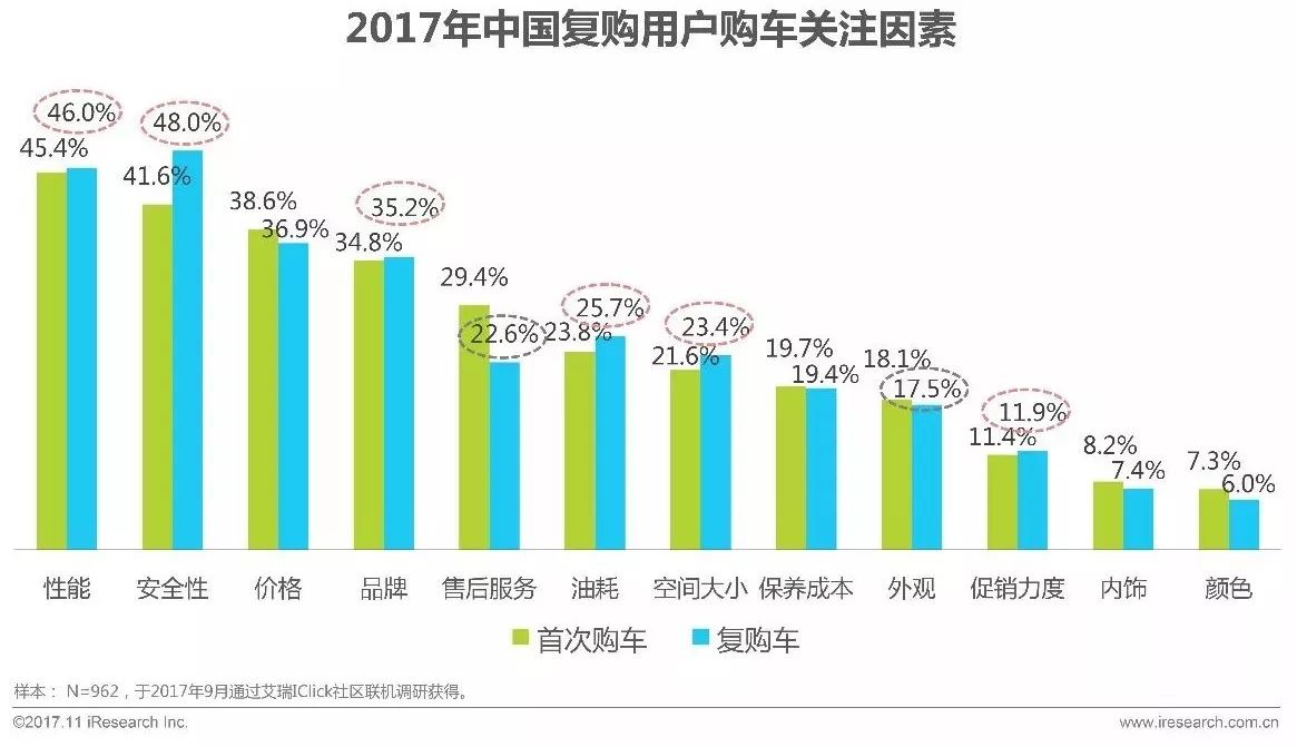 调研数据显示,首次购车用户最关注的是车辆性能因素,复购用户再次购车则最关注车辆安全性因素;复购用户再次购车对价格、售后服务以及外观关注度有所降低,对品牌、车辆空间及排量大小关注度略有提升;