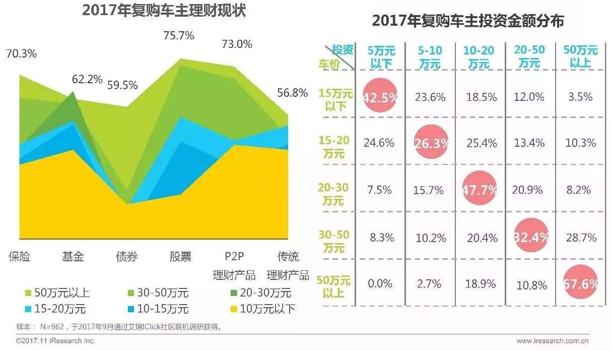 调研数据显示,复购车辆价格区间越高,车主理财意识越好,复购车价在50万元以上车主购买理财产品比例几乎全部高于其他车主;另外理财产品的投资金额跟车辆价格呈现正相关的趋势,车价越高,金融投资越高。