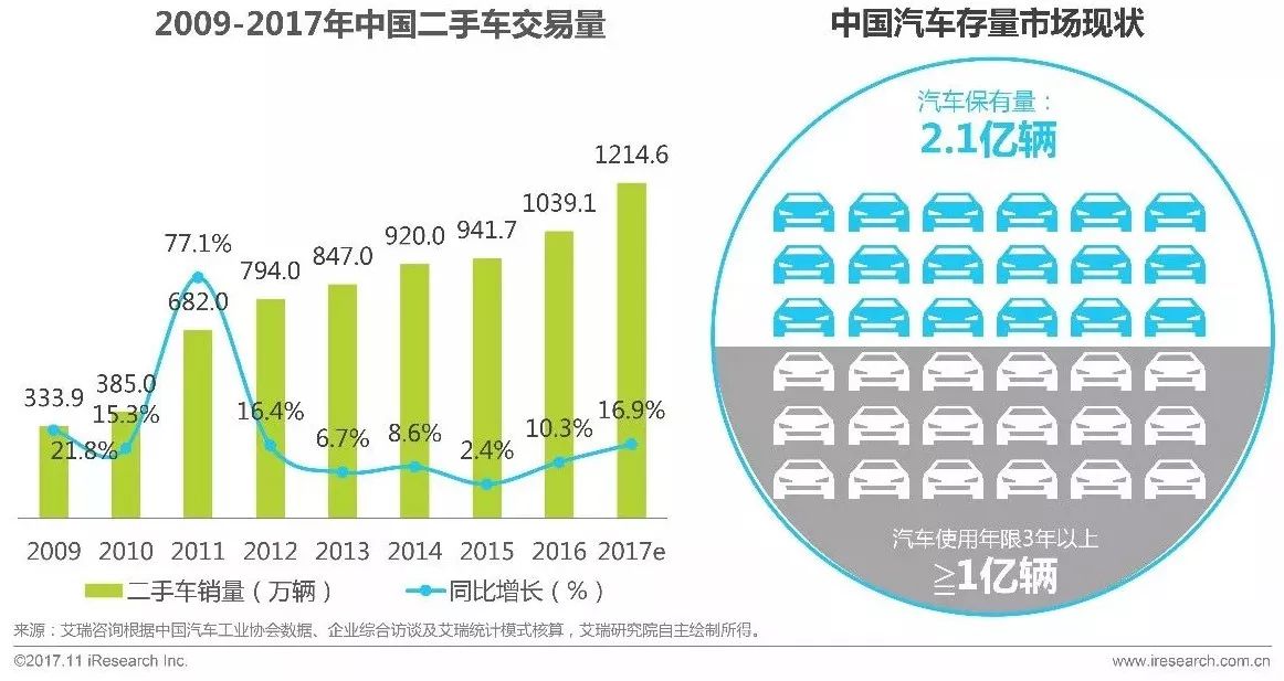 我国二手车市场一直处于不愠不火的状态,2016年,我国二手车全年交易量首次突破千万辆大关;进入2017年,艾瑞预计二手车销量保持两位数增长,全年销量将达1214.6万辆,二手车市场将迎来高速增长期;