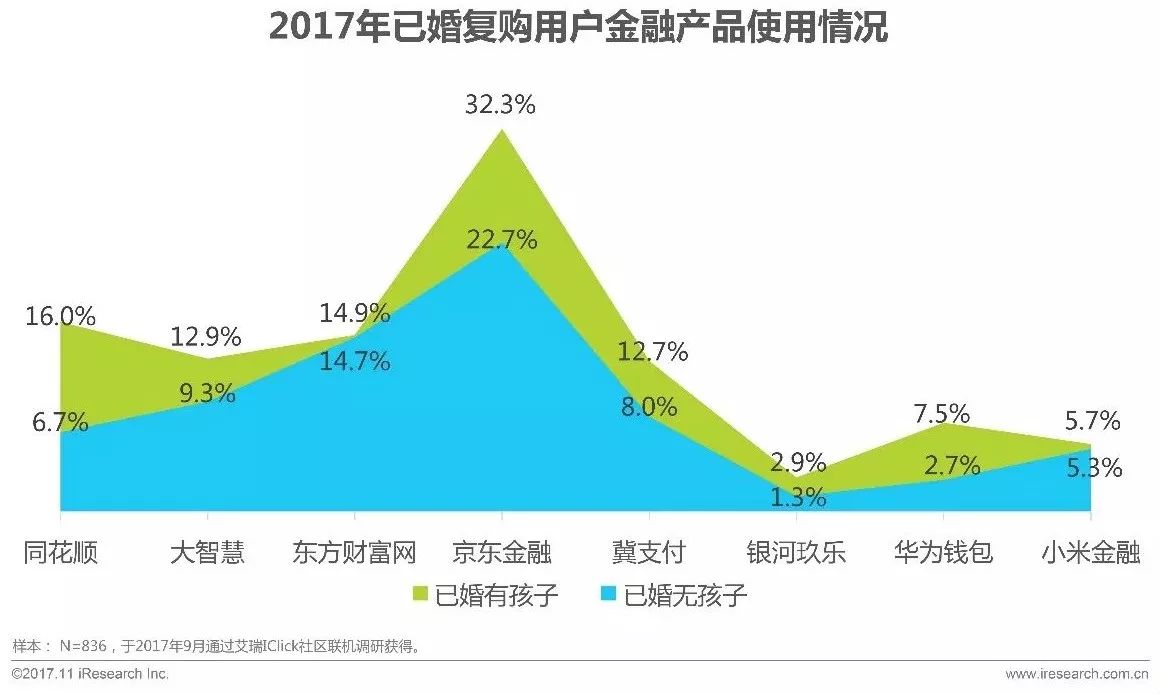 调研数据显示,已婚且已生育孩子的复购用户第三方理财产品使用率均高于已婚无孩子用户,理财意识相对较强。