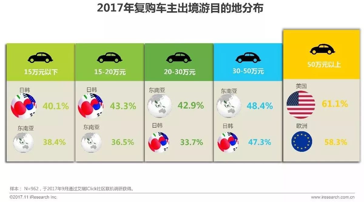 调研数据显示,复购车辆价格在20万元以内车主出国游首选日韩,其次东南亚;复购车辆价格在50万元以上车主出国游更爱选择美国、欧洲,用户选择比例分别高达61.1%和58.3%。