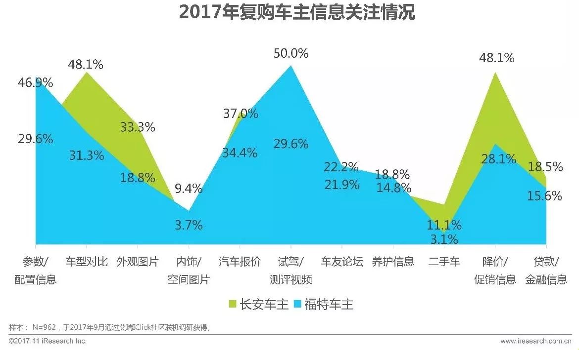 调研数据显示,不同品牌车主关注车辆信息内容差别较大,长安车主最关注促销信息和车型对比信息,福特车主则对试驾/测评视频最感兴趣,用户占比达50.0%。