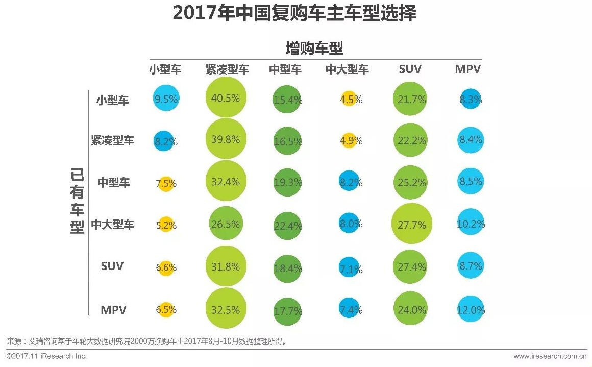 数据显示,紧凑型车是除中大车型车主外,其他所有复购车主增购首选,SUV紧随其次;而中大型车车主增购的第一选择是SUV,其次才是紧凑型车。
