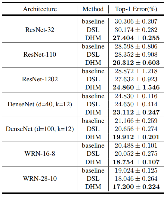 首先,给出了CIFAR-100数据集上所提方法与DSL的性能对比,见下图。尽管DSL可以提升模型的性能,但提提升比较少,而作者所提DHM可以得到更高的性能提升。
