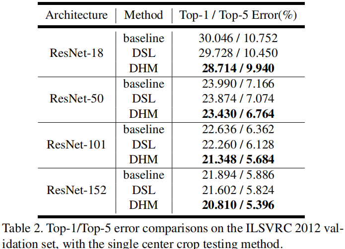 然后,作者给出了ImageNet数据集上的性能对比,见下图。可以得到与前面类似的结论,但同时可以看到:对于极深网络(如ResNe152),DSL的性能提升非常有限,而所提方法仍能极大的提升模型的性能超1%。