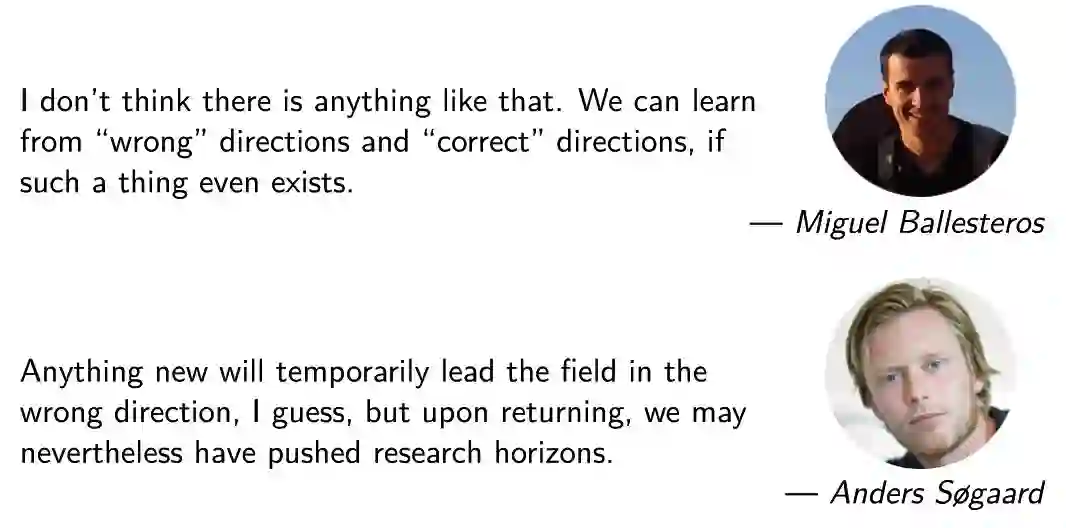 我并不认为该领域曾走到错误的方向。我坚信,科学并不总是直线前进,而是通过带指引的随机游走加深理解。昨天看似错误的方向或许在今天或明天看来就是正确的。例如,2006 到 2012 年很多人(包括我自己在内)曾研究深度网络逐层无监督预训练方法,当时该方法看起来是非常有前景的,但是现在大家不再追求这种方法了(至少不再积极探索了)。这是错误的方向吗?我不这么认为,因为我们从那些年的研究中得到了很多(ReLU、摊销推理等都是那个时代的遗产)。类似地,在 2014 和 2015 年有很多论文将 word2vec 方法应用于各种问题,现在大部分问题都被遗忘了,这是错误的方向吗?兴许不是。我们只是需要这个阶段作为垫脚石。我认为更好的问题在于科学「有指引的随机游走」,指引(guide)是什么?