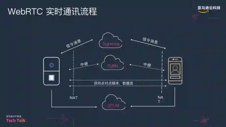 主要依赖 WebRTC 集成。左边是硬件设备,如安防摄像头、可视门铃等,里面会包含各种 SDK,中间是 Amazon KVS,右边是消费端。通过 WebRTC 连接到 Alexa 云,实现双向实时通讯。