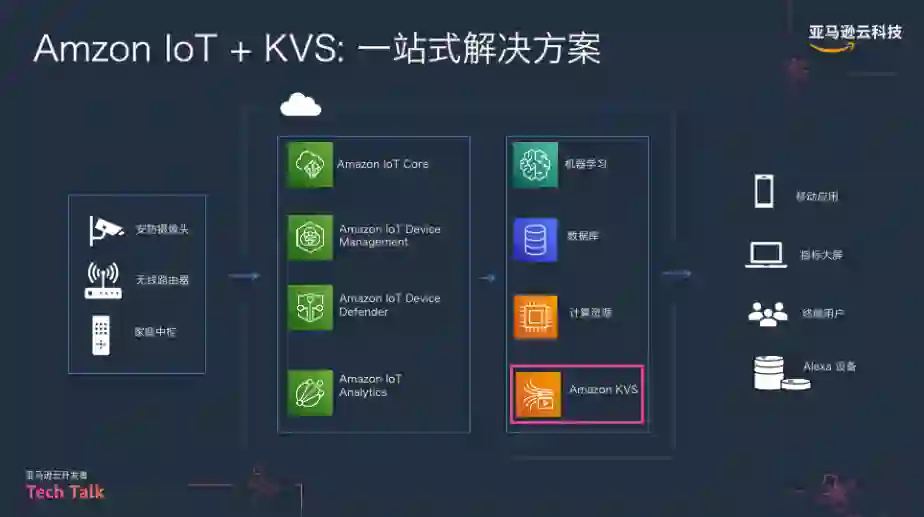 智能视觉市场技术复杂 Amazon IoT 使得您可以简便的构建可扩展的 IoT 应用管理物联网设备,而不需要维护任何基础设施。KVS 提供可扩展的方案用于接收、存储、分析及回放摄像头传输的媒体流。