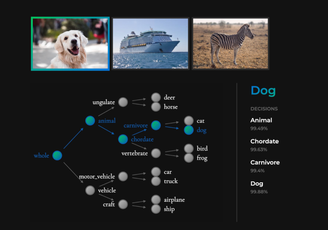 NBDT 具备和决策树一样的可解释性。并且 NBDT 能够输出预测结果的中间决策,这一点优于当前的神经网络。
