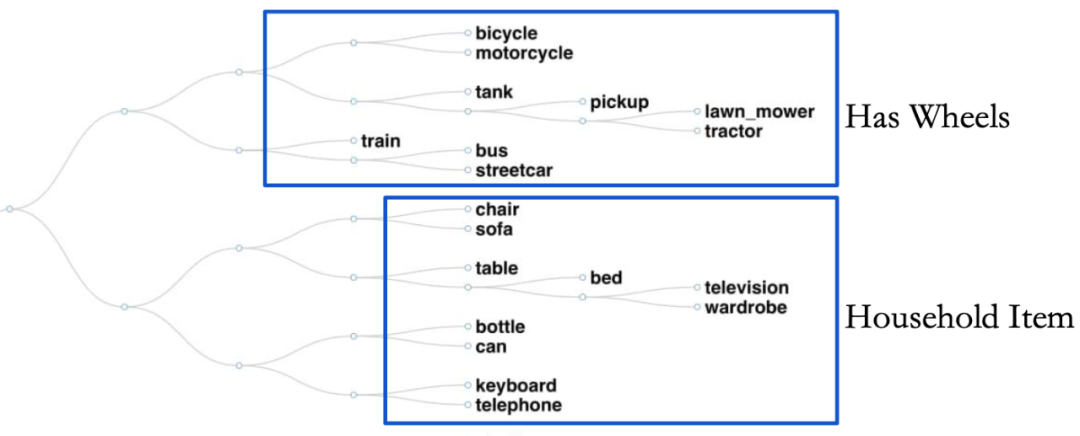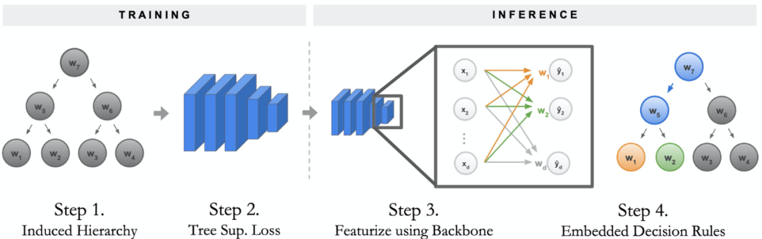 该层级决定了 NBDT 需要决策的类别集合。由于构建该层级时使用了预训练神经网络的权重,研究者将其称为诱导层级。