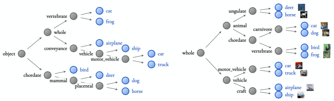 值得注意的是,在具有 10 个类(如 CIFAR10)的小型数据集中,研究者可以找到所有节点的 WordNet 假设。但是,在具有 1000 个类别的大型数据集(即 ImageNet)中,则只能找到节点子集中的 WordNet 假设。