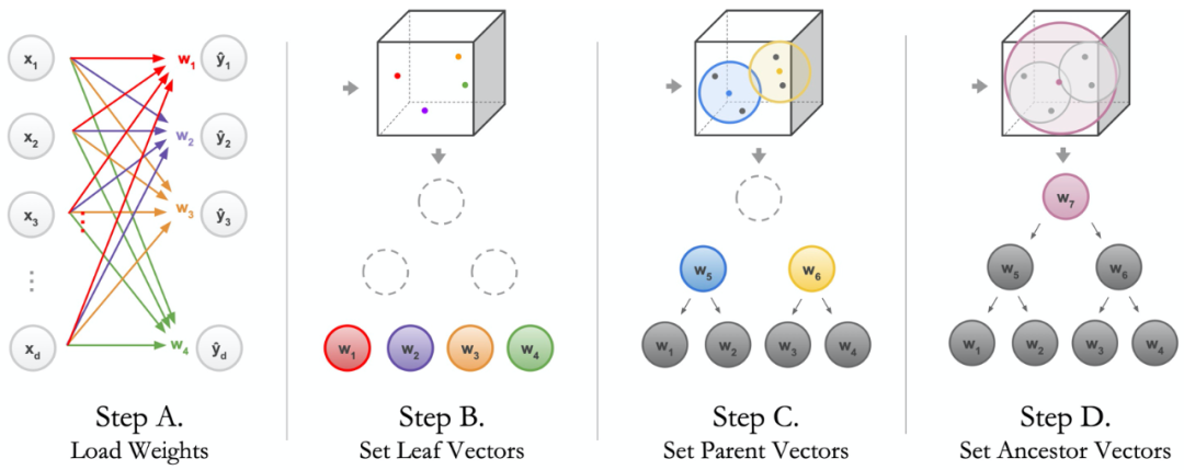 具体地,研究者将全连接层中权重矩阵 W 的每个行向量,看做 d 维空间中的一点,如上图「Step B」所示。接下来,在这些点上进行层级聚类。连续聚类之后便产生了这一层级。