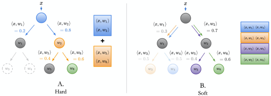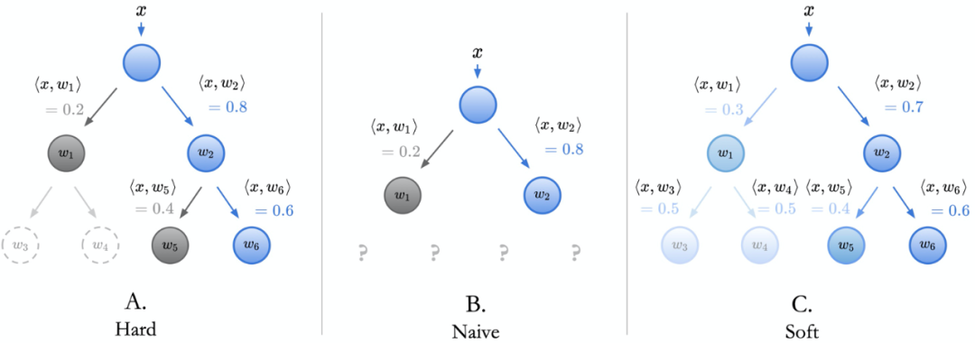 简单决策树(naive decision tree):研究者构建了一个每一类仅包含一个根节点与一个叶节点的基本决策树,如上图中「B—Naive」所示。每个叶节点均直接与根节点相连,并且具有一个表征向量(来自 W 的行向量)。