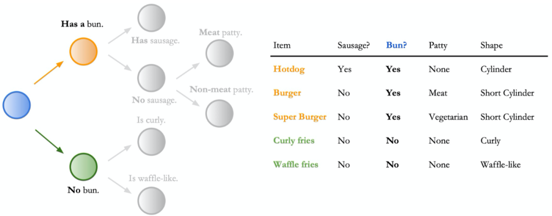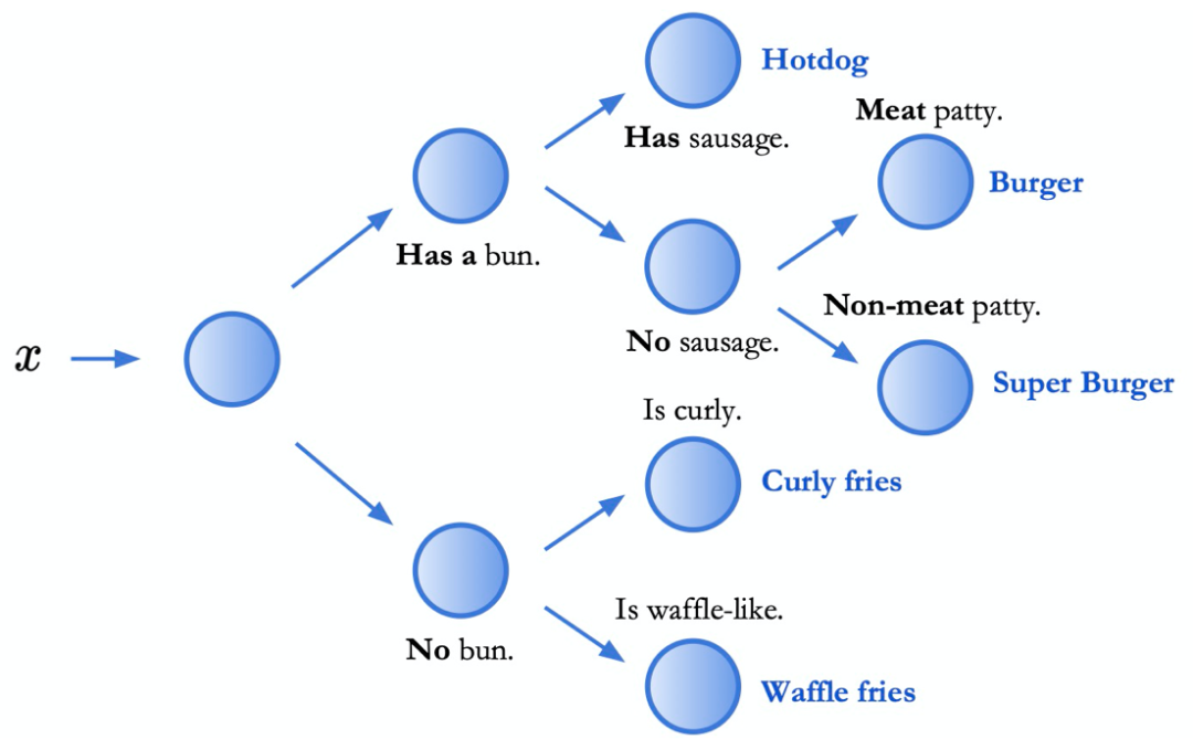 如上图所示,这个决策树不只是给出输入数据 x 的预测结果(是「超级汉堡」还是「华夫薯条」),还会输出一系列导致最终预测的中间决策。我们可以对这些中间决策进行验证或质疑。