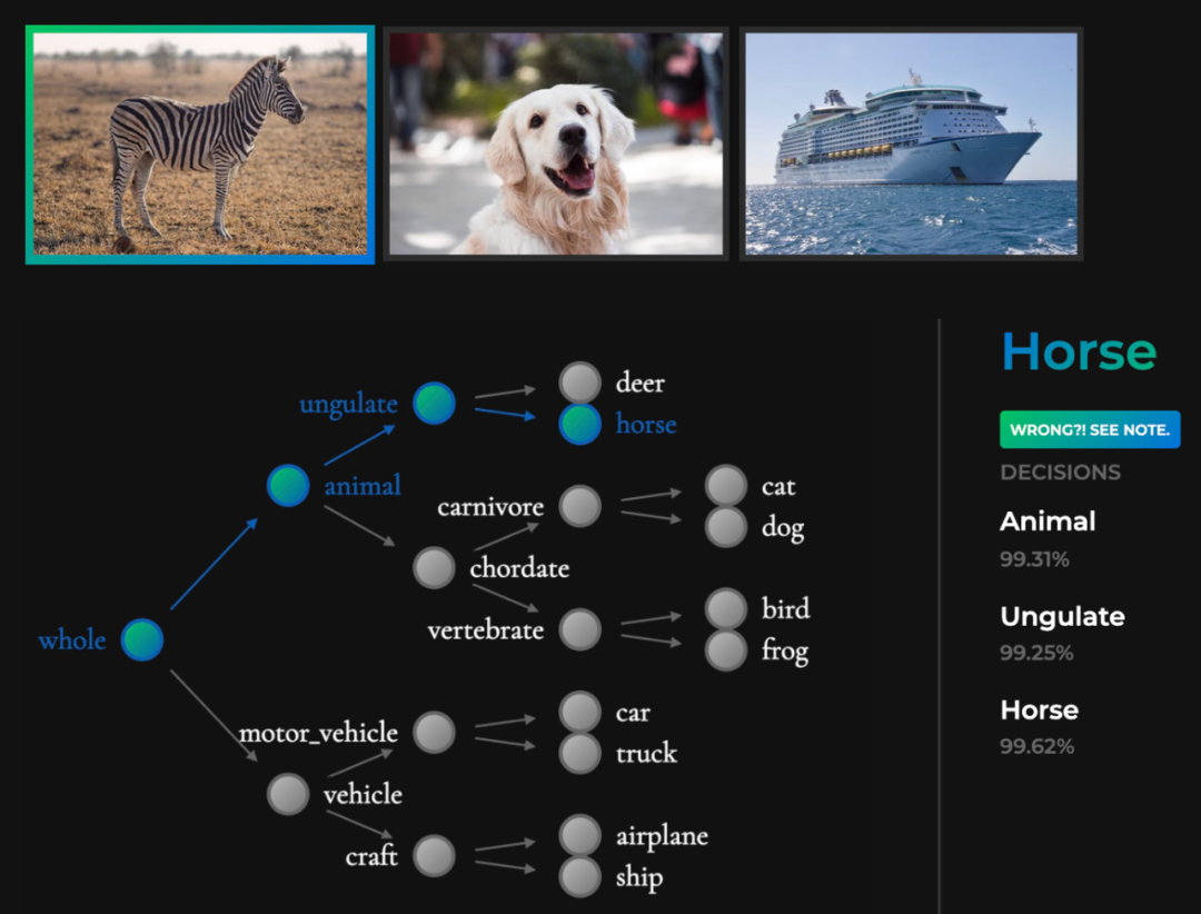 最有参考价值的辩证理由是面向该模型从未见过的对象。例如,考虑一个 NBDT(如下图所示),同时在 Zebra 上进行推演。虽然此模型从未见过斑马,但下图所显示的中间决策是正确的-斑马既是动物又是蹄类动物。对于从未见过的物体而言,个体预测的合理性至关重要。