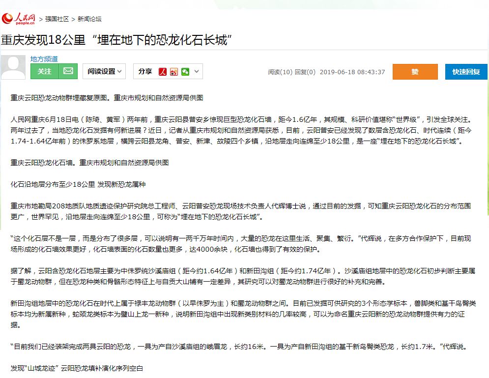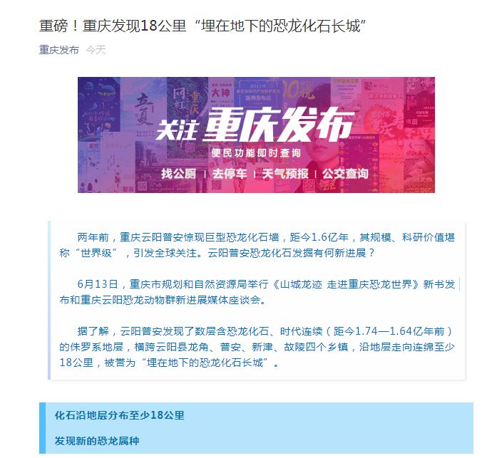 6月13日,重庆市规划和自然资源局举行《山城龙迹 走进重庆恐龙世界》新书发布和重庆云阳恐龙动物群新进展媒体座谈会。新华社重庆站、新华网、人民网重庆发布、重庆日报、华龙网、上游新闻、重庆广播电台等多家媒体进行报道。