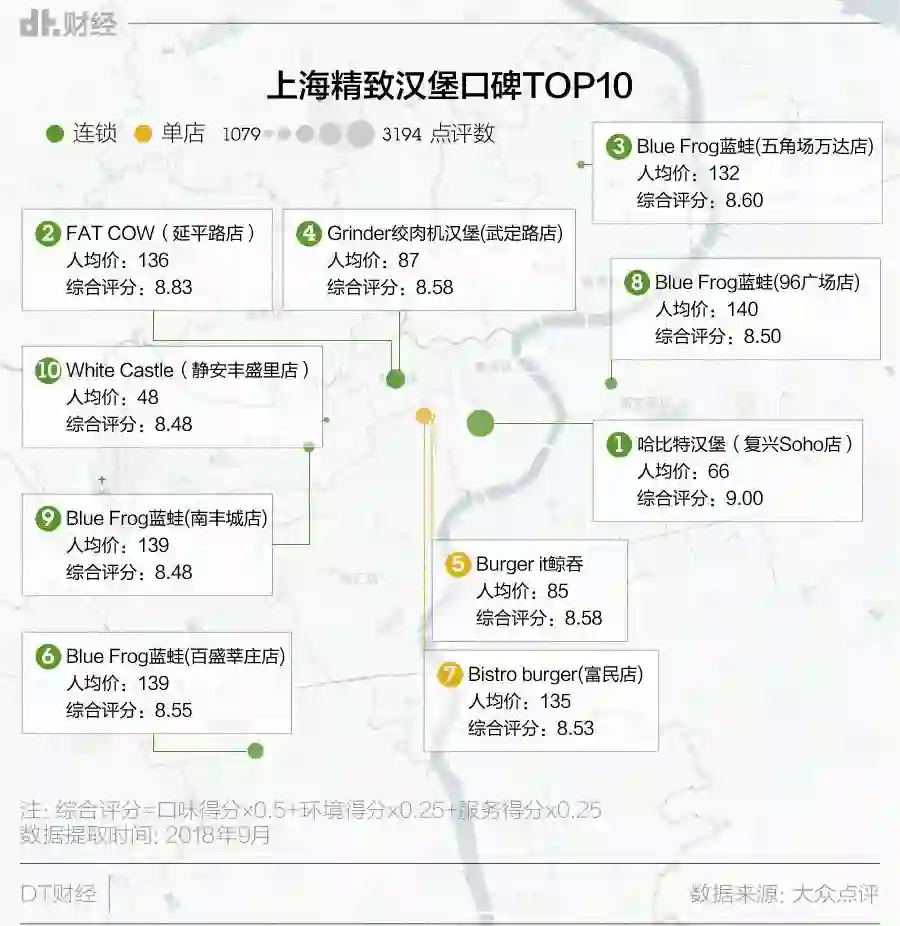 为了更精准地踩点打卡,参考大众点评的评分和点评数量,DT君盘点了魔都口碑TOP10的精致汉堡店地图:
