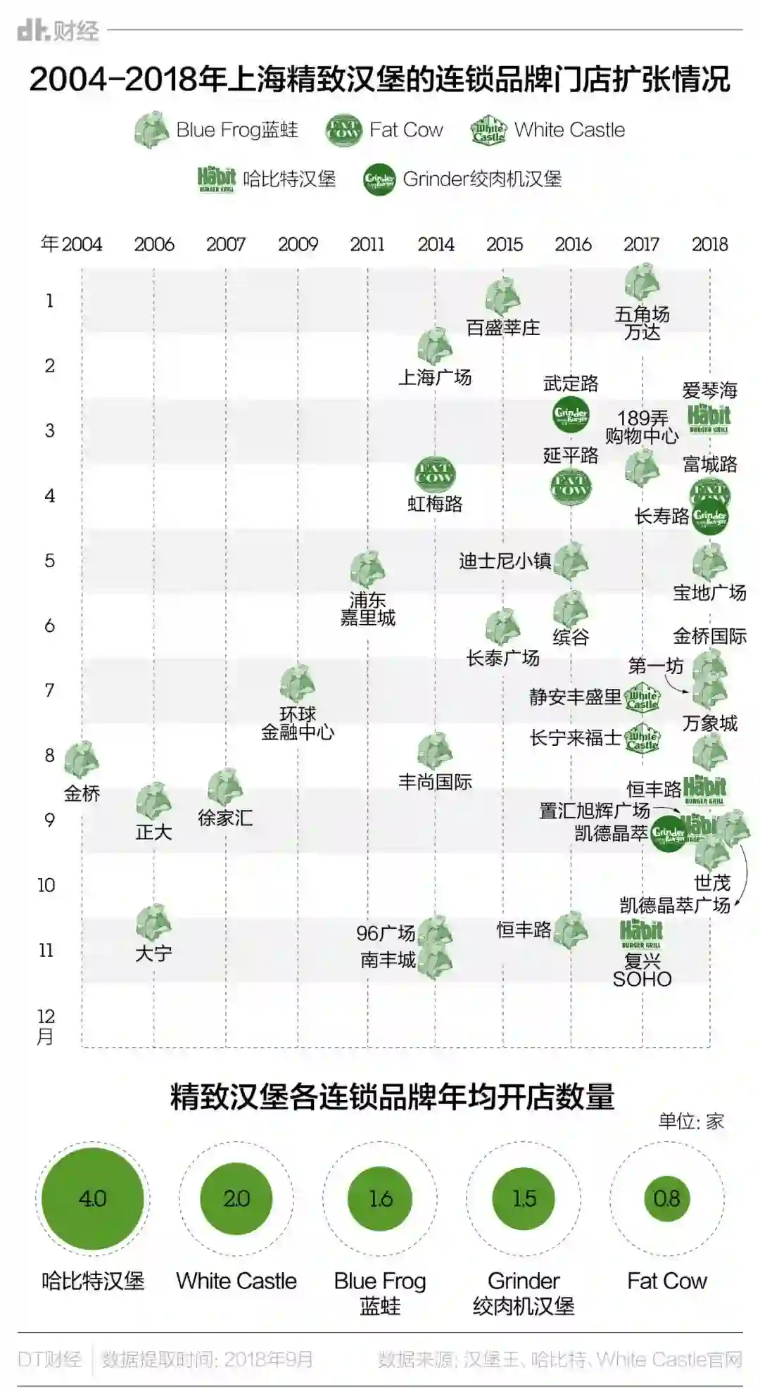 拿门店数量最多的蓝蛙来说。蓝蛙2004年就在魔都起家,以西餐厅模式主推多种口味汉堡,花了14年的时间在魔都开到23家门店,年均开店数不到2家。但进入2018年后,它们加快速度,一鼓作气开出6家门店。