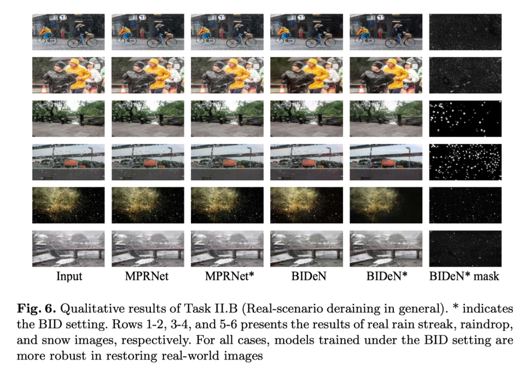 Task II.A 上的结果。BIDeN 总体而言比较平衡,对于不同的 case 都能去除不同的元素。所有 baselines 也是在 BID 的训练 setting 中训练的。Restormer 和 MPRNet 这种非常强的 baseline 在简单的 case (case1-2) 表现很好,但在其他复杂 cases 上的表现会略微差一些。