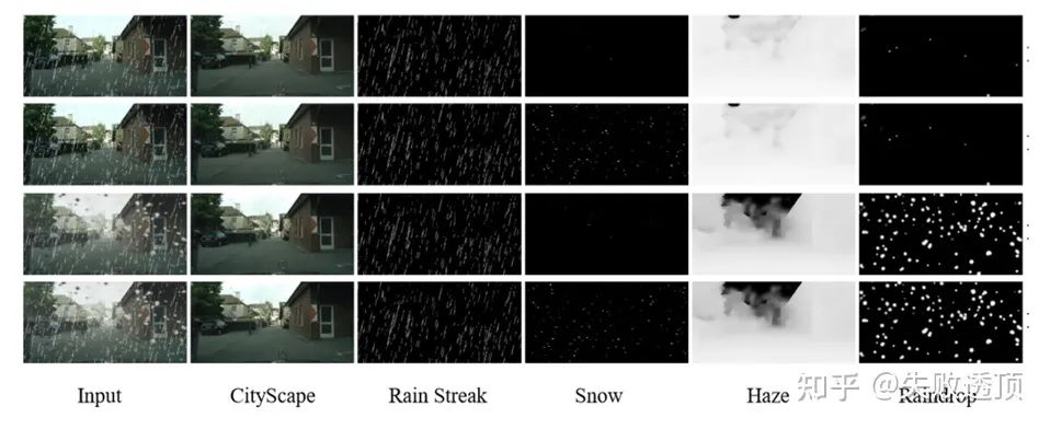 ▲ 任务II是去雨,II.A中是在Cityscape上合成雨天的图像。II.B中主要是用自然图像作为rain-free图