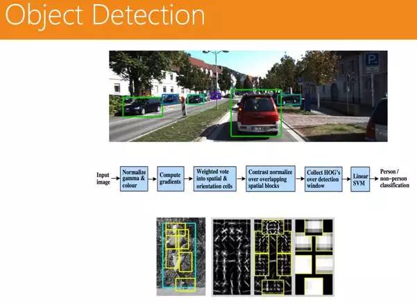传统方法主要是针对固定物体的检测。一般的方法是 HOG( 方向梯度直方图),然后再加一个 SVM 的分类器。而对于动态物体的检测,主要使用的是 DPM 模型的方法,先把手和脚识别出来,再进行组合。
