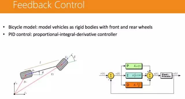 而最后的反馈控制则是由车厂来做,而且很多车厂采取的方案是不一样的。实现反馈控制的一般有双轮模型和 PID 控制模型,后者实现起来比较顺畅。
