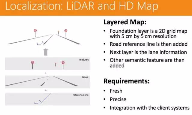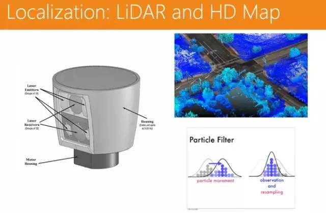 激光雷达的好处是有一定的射程,能触及 100-200 米的距离,能很精准的得到空间中的点(3D 点云)。将激光雷达的数据和高精地图的数据做一个匹配,可以将车辆定位上升到厘米级别。