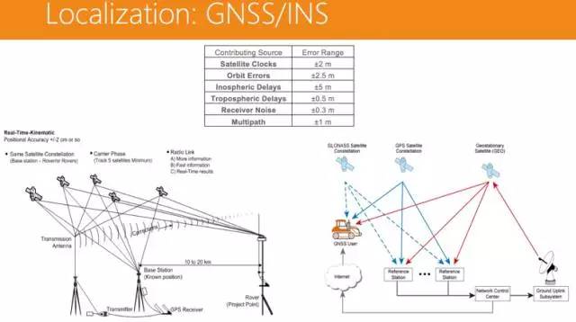 我们平常用的是多星 GPS,可以接收伽利略或北斗的信号,做一个综合,然后得出一个相对精准的位置。但是多星 GPS 的定位精度大约能做到 1-2 米,这满足不了无人驾驶车道级定位的要求。所以,后续业内又开发出一种被称为 RTK(Real-Time-Kinematic)的 GPS,主要是依靠在地面布置基站,通过基站的信号去纠正卫星的信号,精度可以达到分米级别甚至更低。但缺点是需要布置基站,成本很高,还需要人维护。接下来,又出现一种称为 PPP(精密单点定位)的 GPS 技术,基于全球卫星的联网系统,通过互联网发布卫星的纠正信号,这项技术大概在 2018 年会在全球进行部署。其好处在于不需要布置基站,无论在哪,都能得到一个比较精准的位置。