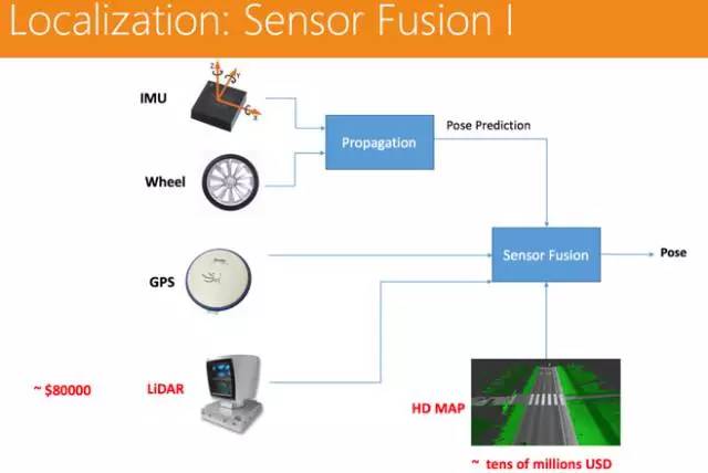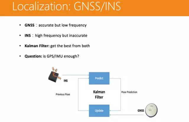 通过 IMU 和轮速计,得到车辆初始的位置,而 GPS 则可以不断纠偏,把错误率控制在一定的范围,比如 GPS 是厘米级的,那么精度就能保证在厘米级别,同时再加上激光雷达和高精地图的匹配,得出一个最终的很精准的位置。